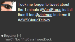 מאוד נהנתי מהתגובות למצגת שלי והעובדה שעשיתי Live Demo במצגת של 10 דקות, תוך שימוש בחיבור WiFi ציבורי, מצאה חן בעיני רבים. אהבתי את התגובות בטוויטר ובמיוחד את התגובה של יותם תבור (Reysbro@) המובאת כאן משמאל.