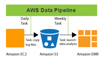 לדוגמא, ניתן לקחת קבצי Log ממספר שרתים, לעבד אותם לקובץ יומי בודד ולשמור את המידע על S3. אמנם לא דוגמא מורכבת אבל, בעיני, היתרון הגדול של Data Pipelines הוא היכולת להרים מכונות EC2 או כל מרכיב ממגוון הכלים של AWS כחלק מהתהליך. בדוגמא משמאל, מופעל תהליך ניתוח של אותו Log, אחת לשבוע, באמצעות Elastic MapReduce.